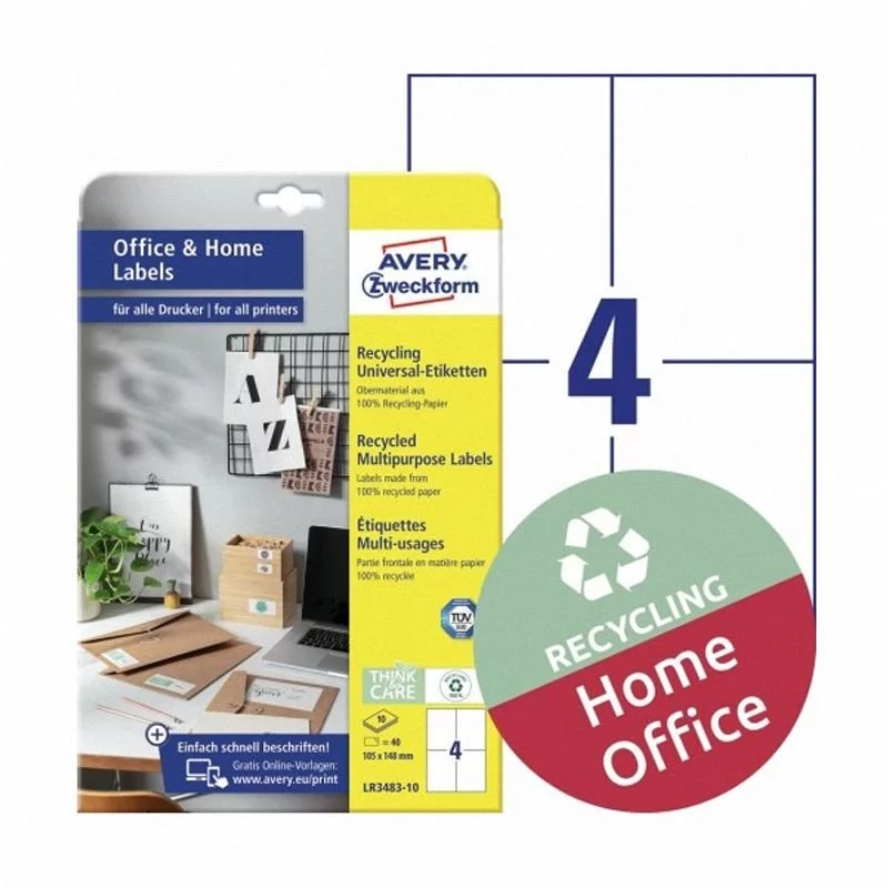 Etykiety Samoprzylepne Recyklingowe Avery Office&Home 105x148 4/A4 A'10 Białe No.LR3483-10