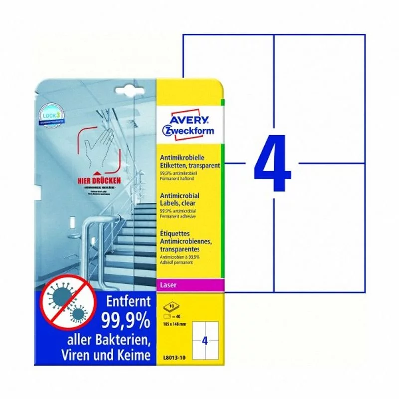 Folia Samoprzylepna z Powierzchnią Antydrobnoustrojową Avery 105x148 4/A4 A'10 Przezroczysta No.L8013-10