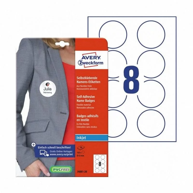 Usuwalne Samoprzylepne Identyfikatory Okrągłe Foliowe Avery śr.65 8/A4 A'20 Białe No.J4881-20