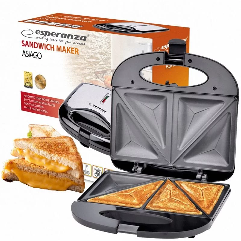 Opiekacz Esperanza ASIAGO posiada talerze powleczone warstwą zapobiegającą przywieraniu. Można go łatwo wyczyścić nawet samym ręcznikiem papierowym. Dzięki szybkiemu podgrzewaniu pozwala na przygotowanie wymarzonej kanapki w dosłownie kilka minut. Jeśli chcesz każdego ranka jeść smaczną kanapkę, zapraszamy. Smacznego!