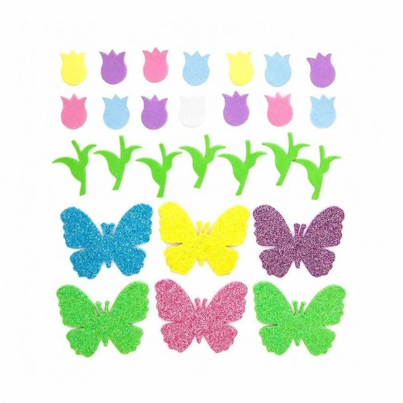 Zestaw naklejek z pianki w kształcie tulipanów w kilku kolorach oraz brokatowych naklejek w kształcie motyli. Świetnie nadają się do wszelkiego rodzaju dziecięcej aktywności twórczej, jak również do zdobienia wielu projektów kreatywnych.