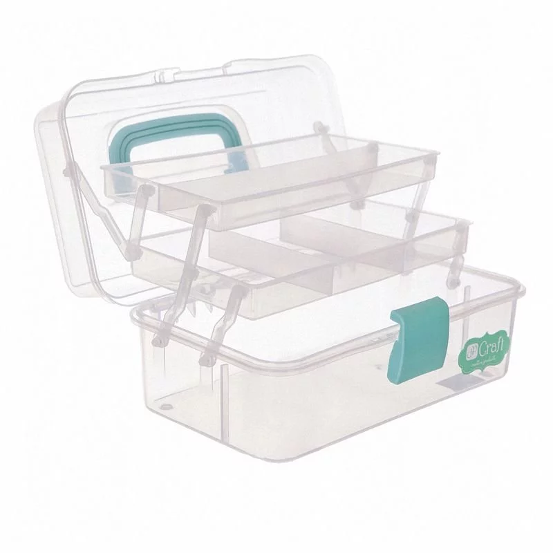 Plastikowy kuferek-organizer to must have każdego craftera! Idealny do przechowywania drobnych dodatków, ale też świetnie sprawdzi się jako pudełko na dziecięce skarby. Wykonany z przezroczystego plastiku, z rączką i zamknięciem w kolorze miętowym