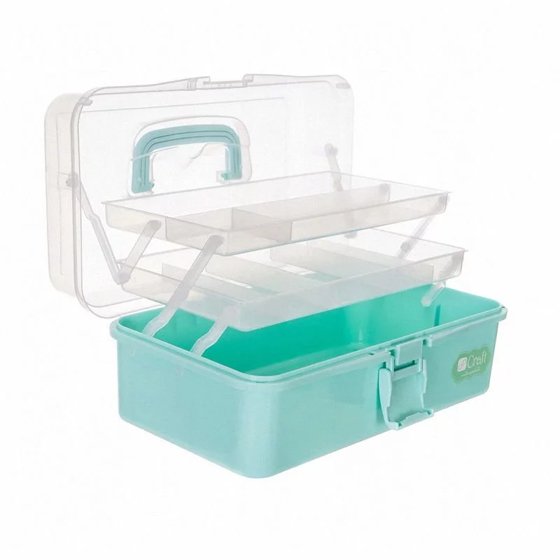 Plastikowy kuferek-organizer to must have każdego craftera! Idealny do przechowywania drobnych dodatków, ale też świetnie sprawdzi się jako pudełko na dziecięce skarby. Wieczko wykonane z przezroczystego plastiku, z rączką i zamknięciem w kolorze miętowym, podobnie jak dno pudełka.