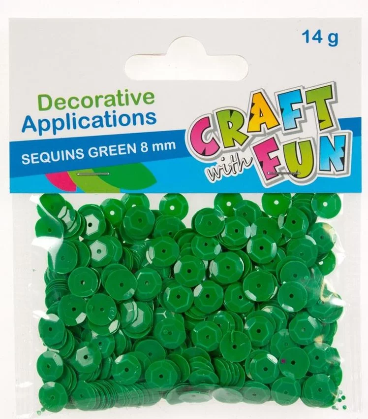 Przy pomocy Cekinów Craft with Fun można zaprojektować własne ozdoby lub dekoracje. Idealne do wykonywania wszelkich prac dekoratorskich, jak również do zabaw plastycznych, do wzbogacenia ozdób wykonanych techniką decoupage. Używaj tych produktów w połączeniu z innymi akcesoriami oraz kompletami z serii Craft With Fun! Opakowanie zawiera pastelowe, okrągłe cekiny w zielonym kolorze o średnicy 8 mm. W opakowaniu znajduję się 14 g. cekinów. Cekiny wykonane z plastiku. Produkt przeznaczony dla dzieci w wieku: 3+. Pakowany w folię z zawieszką. Wymiary opakowania(szer. x wys.) [cm] 10x11.