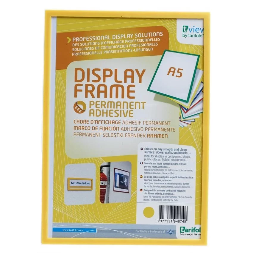 Samoprzylepny identyfikator naścienny wykonany jest według opatentowanej technologii firmy Tarifold. Produkt wyposażony jest w bardzo mocną ramkę wykonaną z tworzywa ABS, która pozwala zniwelować zagrożenie pęknięcia identyfikatora po jego upadku. Dzięki różnorodności kolorów i formatów produkt w efektywny sposób umożliwia podkreślenie najważniejszych informacji. Na tyle identyfikatora został zamieszczona taśma samoprzylepna, która daje możliwość zamocowania produktu na każdej gładkiej powierzchni. Prezentacja informacji możliwa jest zarówno w pionie jak i w poziomie. Format A5, kolor żółty.
