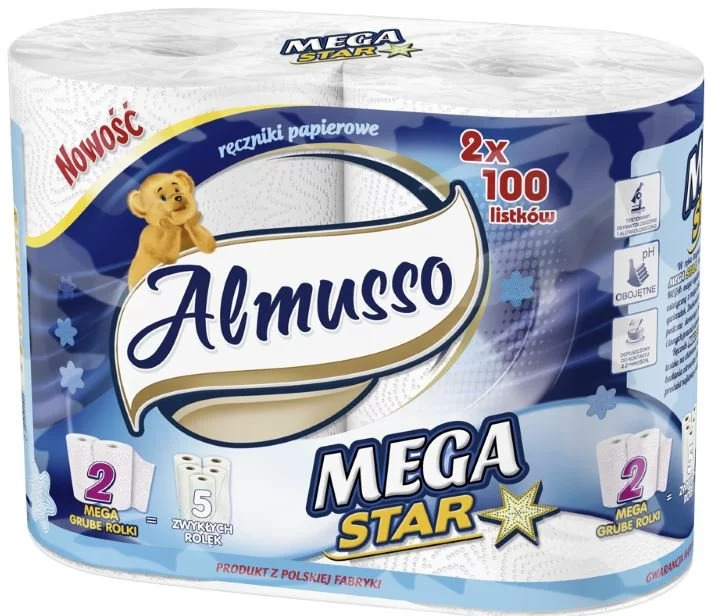 Duże dwie rolki ręcznika kuchennego 2-warstwowego wykonane są w 100% z czystej celulozy.